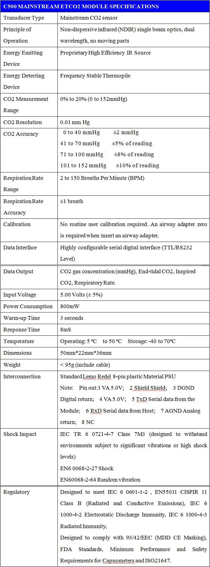 The C500 mainstream ETCO2 sensor is the best cost performance mainstream ETCO2 sensor sold on the market. It just needs 3 seconds to warm up. C500 can recognize all kinds of adapters, no matter new or abrasive adapters. Even if the adapter is dewing equality, C500 still can get the accurate CO2 values.The C500 is designed specifically for mainstream measurement of CO2 using sophisticated infrared absorption spectroscopy.The measurements are taken at the patient airway at a sampling frequency of 100 Hz. It uses the same interface to the patient monitoring system as the C300 Side stream CO2 Module making it easy to configure a patient monitoring system with CO2 monitoring technology that is affordable and easy to use.