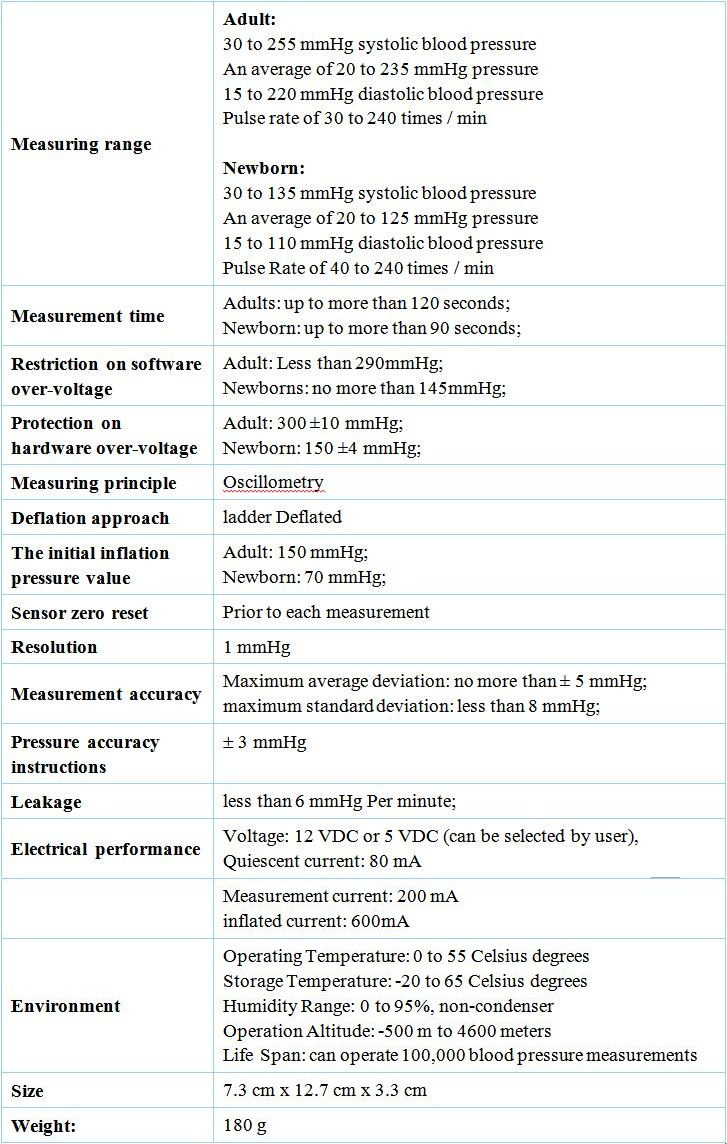 Light points: Small in size, simple, excellent reliability and ease of installation clinical monitoring of the accuracy Excellent reliability and accuracy of clinical monitoring The latest digital signal processing technology to achieve anti-noise and software algorithms anti-interference by moving arm; Capable of accomplishing all NIBP measurement items; Comply with CE safety design; Comply with all NIBP standard of ANSI/AAMI; Applies to adults, children and Newborn; 5V/12V single power supply to avoid interference with the digital circuit by the pump; Fully compatible with the protocol of CAS Non-invasive blood pressure module (NIBP)